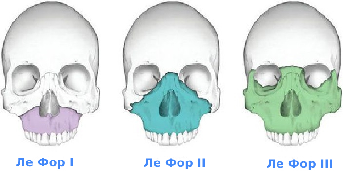 - Ле Фор I (нижний, горизонтальный): разлом находится на нижней части кости между альвеолярным, небным отростками.